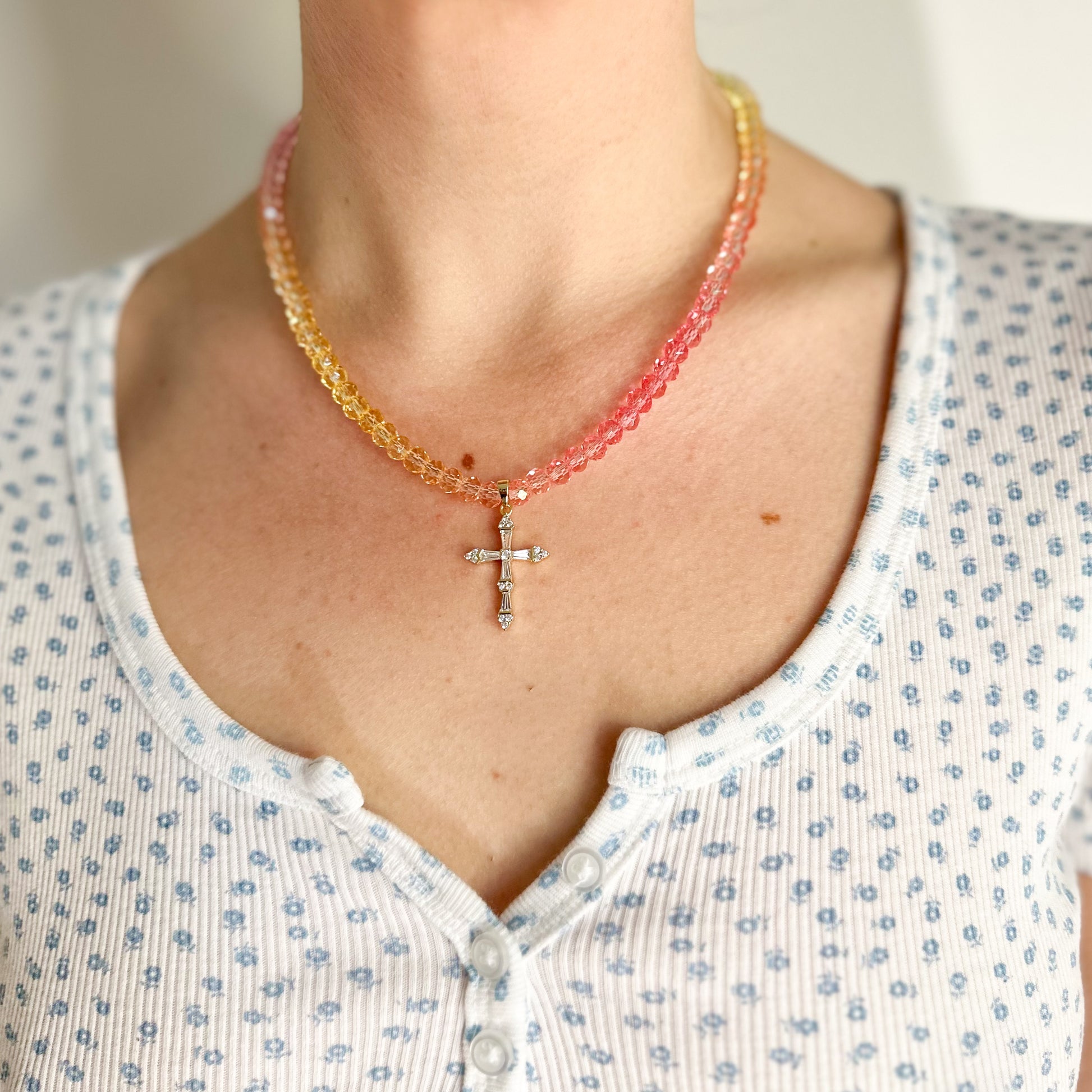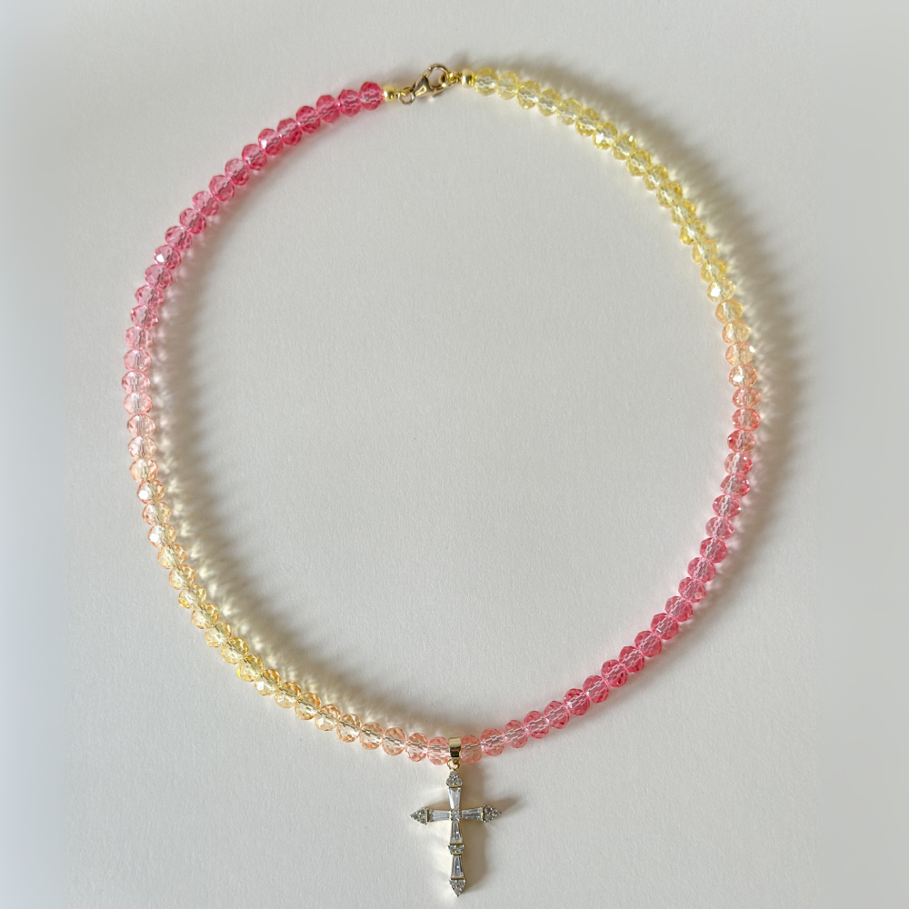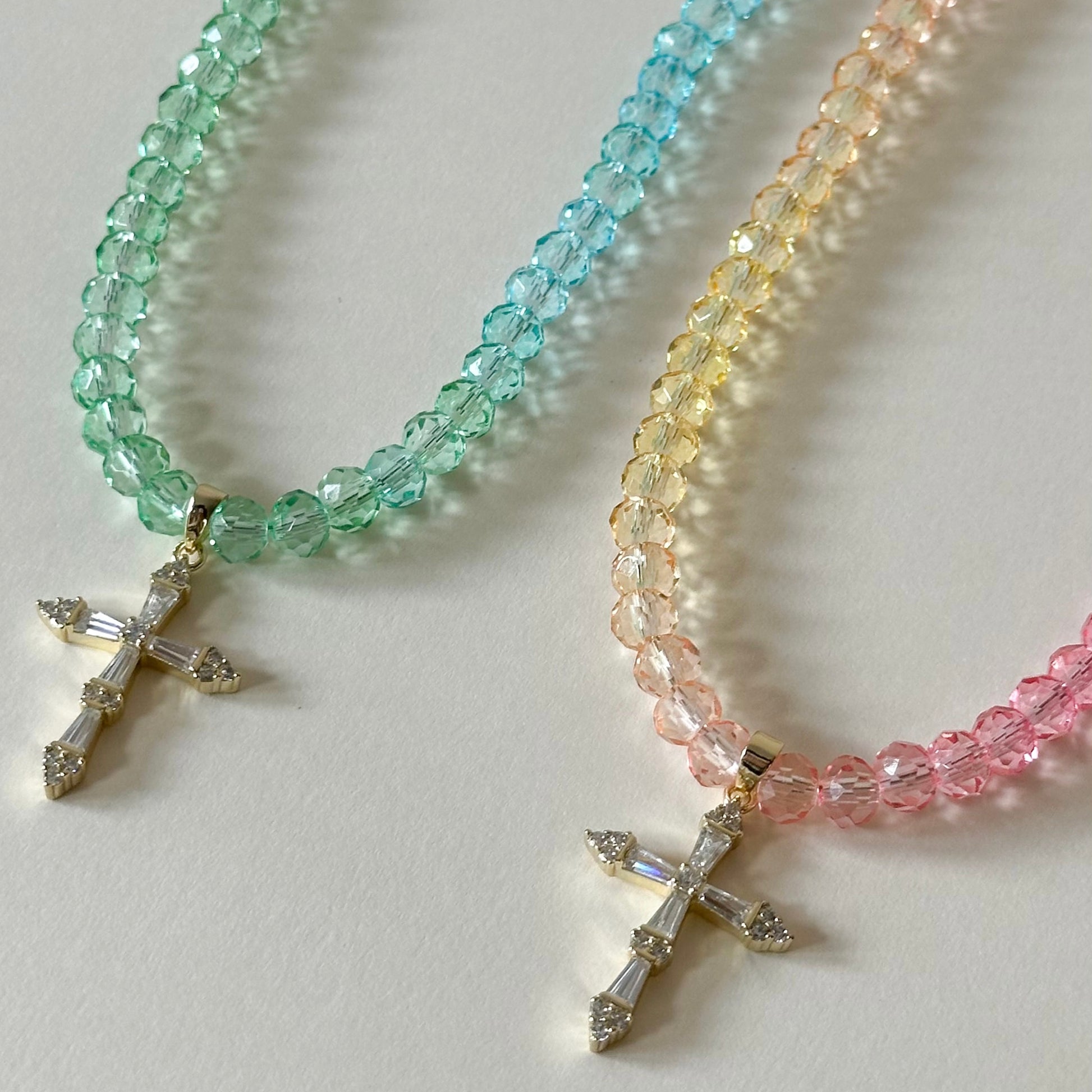 A vibrant and must-have necklace for the summer! Made of glass beads and a gold-plated sterling silver cross with zircons, this necklace makes a bright, playful statement that brings energy and style to any summer outfit.